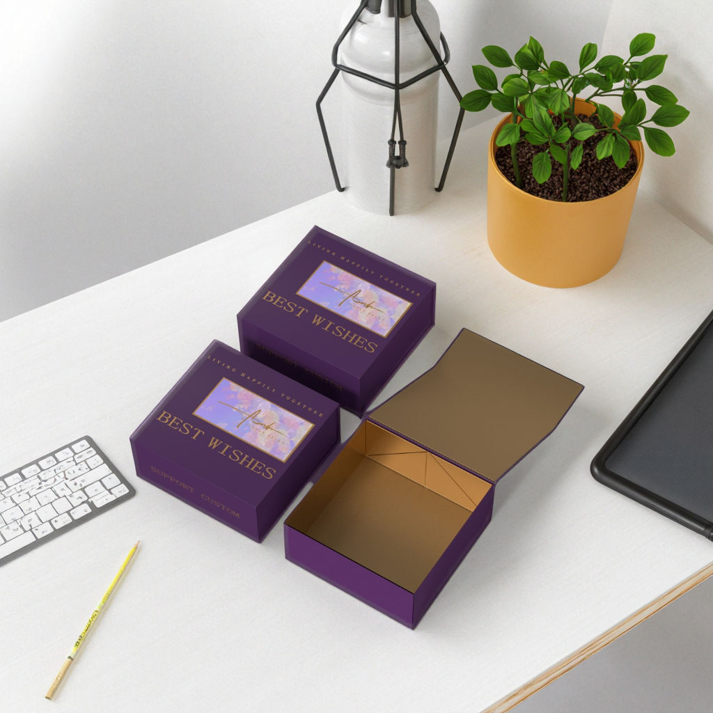 Elegant matte purple and gold magnetic closure gift box with embossing logo printing, designed for luxury clothing and premium retail packaging.